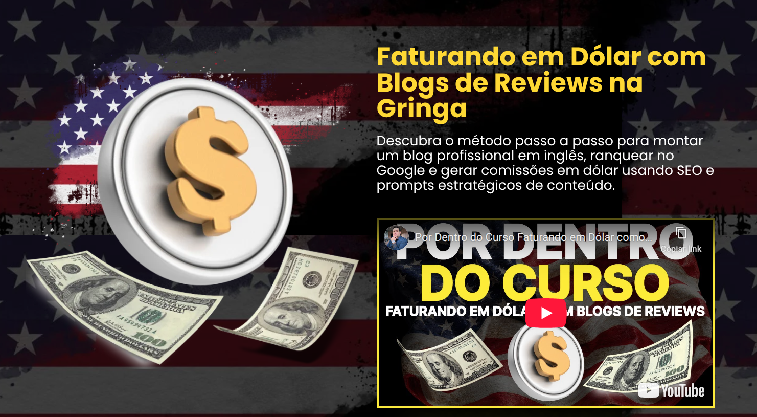 Se você está buscando uma forma real de ganhar dinheiro como afiliado no mercado internacional, o Curso Faturando em Dólar como Afiliado com Blogs de Reviews na Gringa promete ensinar exatamente isso: como criar blogs em inglês, ranquear no Google e gerar comissões em dólar usando SEO e inteligência artificial.