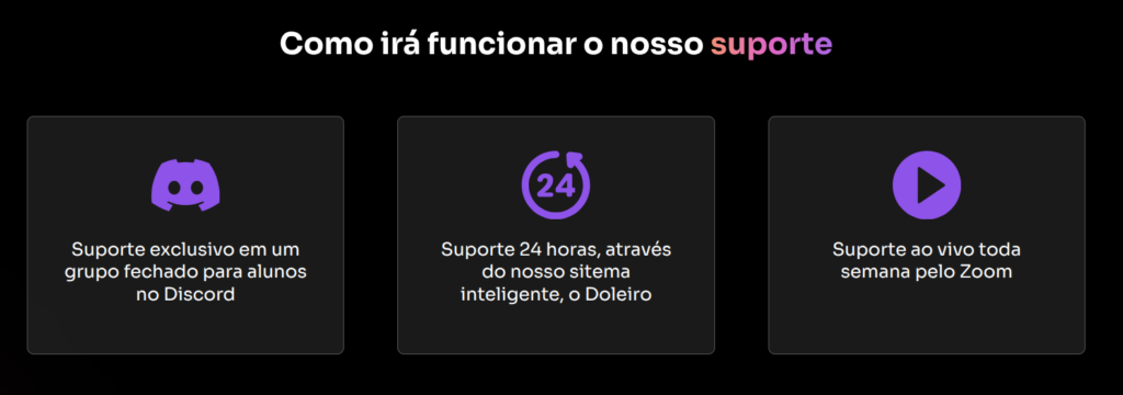 Sim. O curso oferece grupo fechado no Discord, mentorias ao vivo e suporte 24h.
