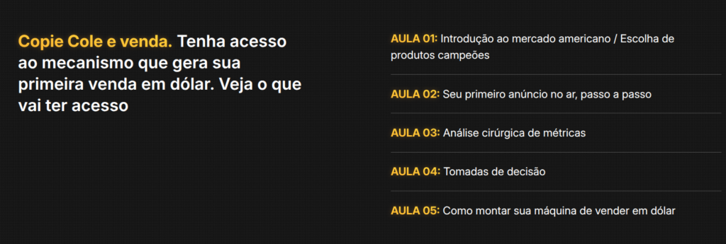 A proposta é clara: ensinar pessoas comuns a fazerem sua primeira venda em dólar em poucos dias, usando um método simples, validado e acessível até para quem nunca vendeu nada no digital.